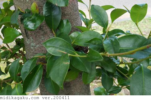 公園にも植えられている、モッコク科の植物です。神事によく使われます。つやがありギザギザしていない葉を持ちます。