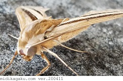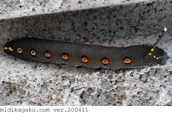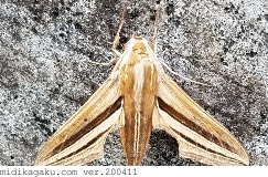 スズメガ科の昆虫です。成虫はその名の通り、筋の模様が体に入っています。幼虫は黒い体に黄色とオレンジ色の点が良く目立ちます。ヤブガラシ等を食べているところをよく見かけます。